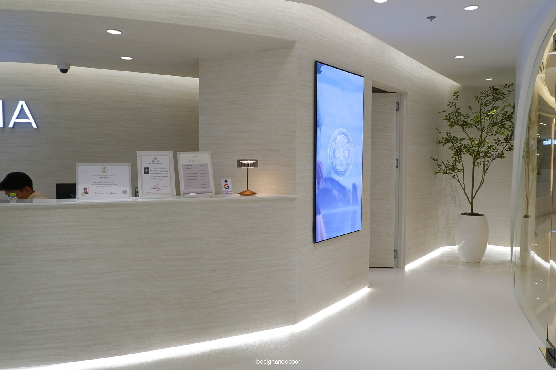 และตกแต่งบรรยากาศด้วยไฟ Strip light ไปทั่วร้านบริเวณหลืบซ่อนต่างๆเป็นแสง 3000-4000K
